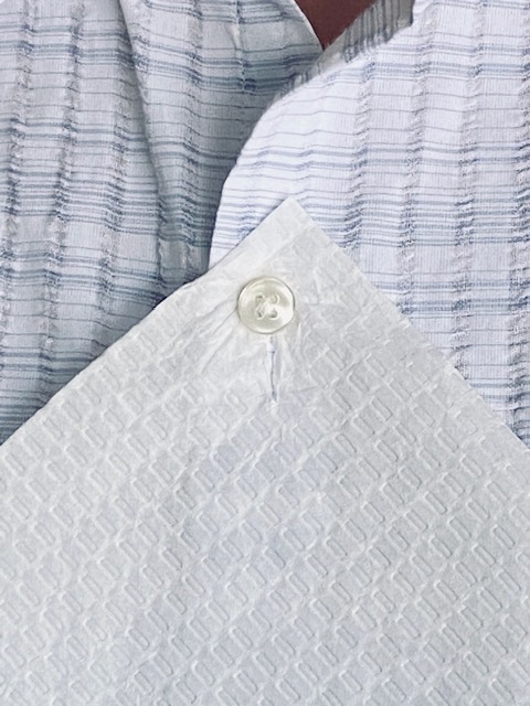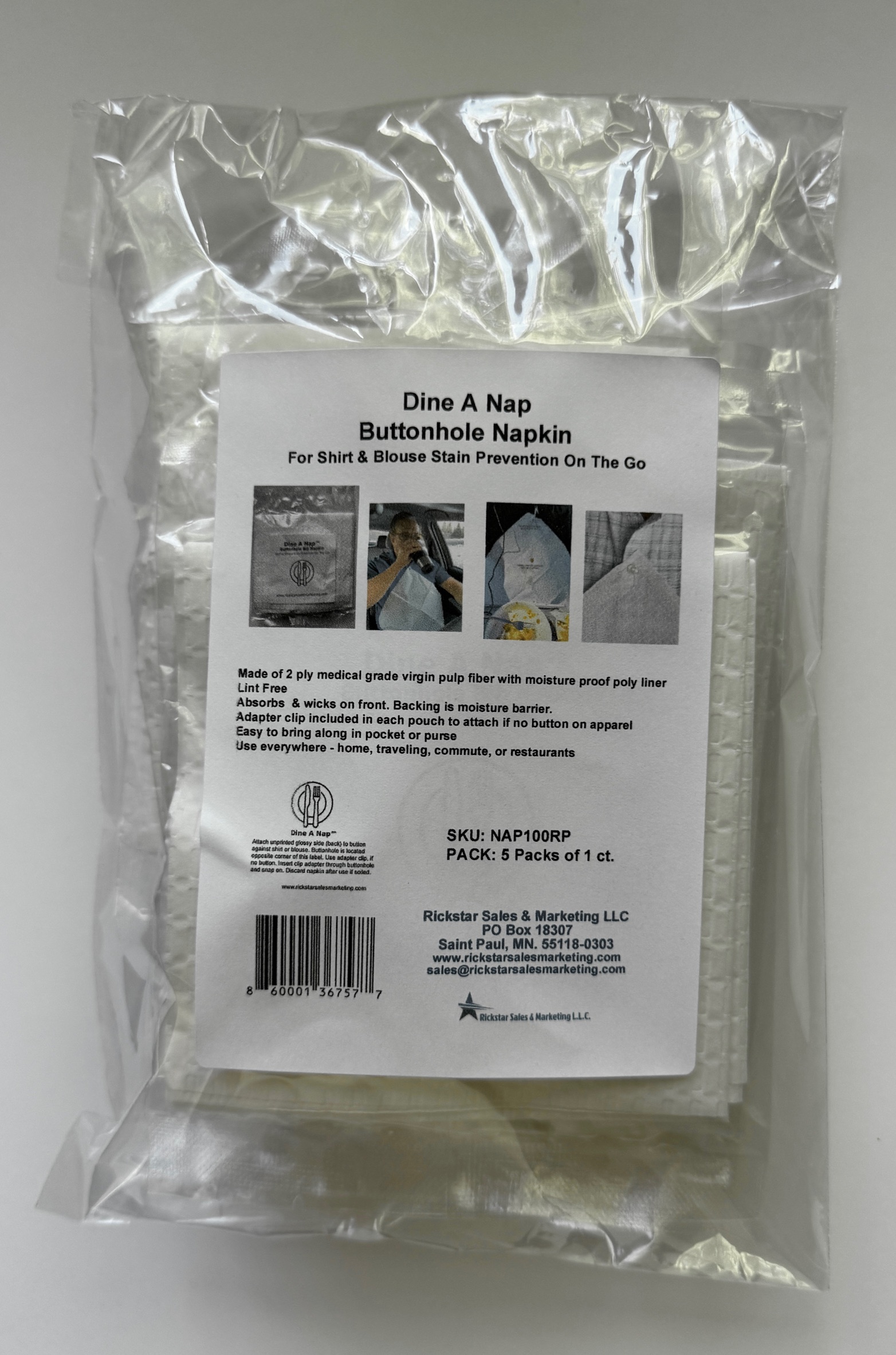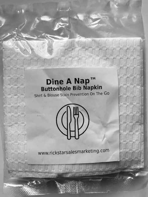 Individually wrapped bib napkins with a buttonhole that can be attached to one’s shirt or blouse. Help prevent accidental stains when eating out or at home. Perfect for commutes, travels such as cruises and airplanes when possible unexpected movement happens. Good for all ages. The product is an extension to our popular Dine A Nap Commercial product.
