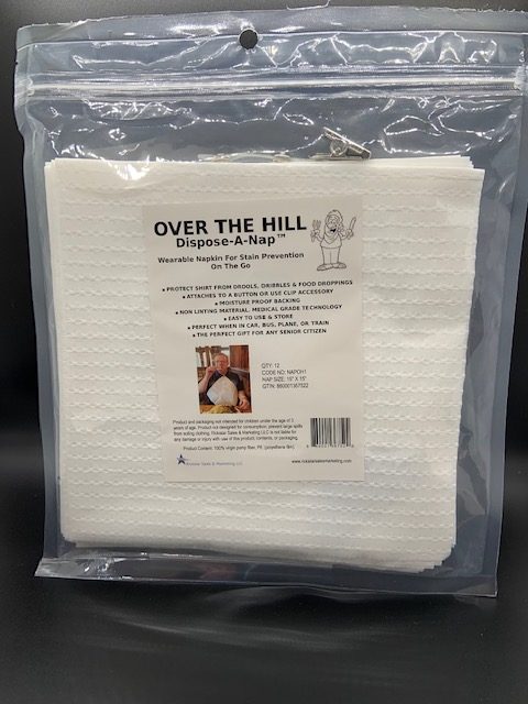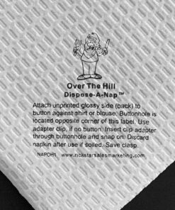 Over The Hill Dispose-A-Nap™ ON SALE is the perfect novelty gift item for that family or friend celebrating their milestone 50+ birthday. This disposable travel accessory is perfect when eating or drinking on the go. Use it on the go or just eating out on the town. Attaches to shirt or blouse button. Helps prevent those embarrassing accidental drips, drops, dribbles, and spills of food or beverage on clothing. Easy to use and carry. Made from medical grade paper technology. Triple layered to prevent stains from soaking through. Save your clothes with Dispose-A-Nap™!